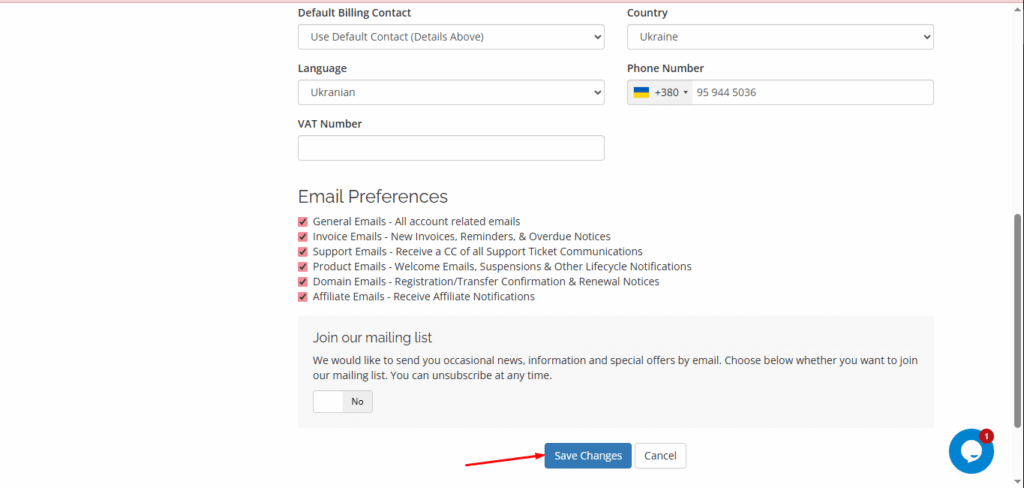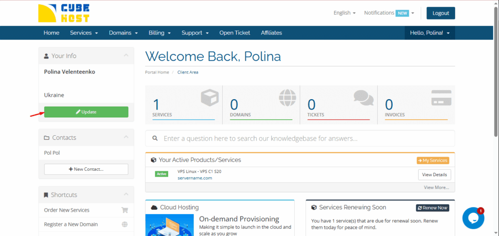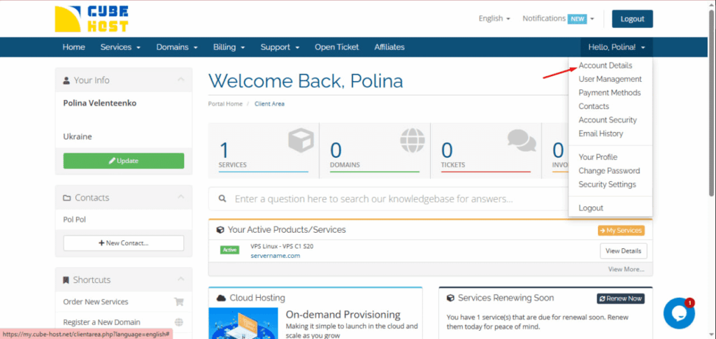 In your Cube-Host personal account, you can change your contact details, interface language, phone number, and email notification settings.