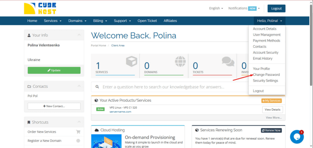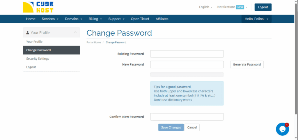 You can change your Cube-Host account password at any time through your personal account.