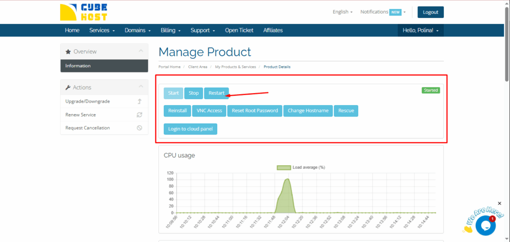 You can see the server status on the right — it is displayed as Started when the VPS is running.