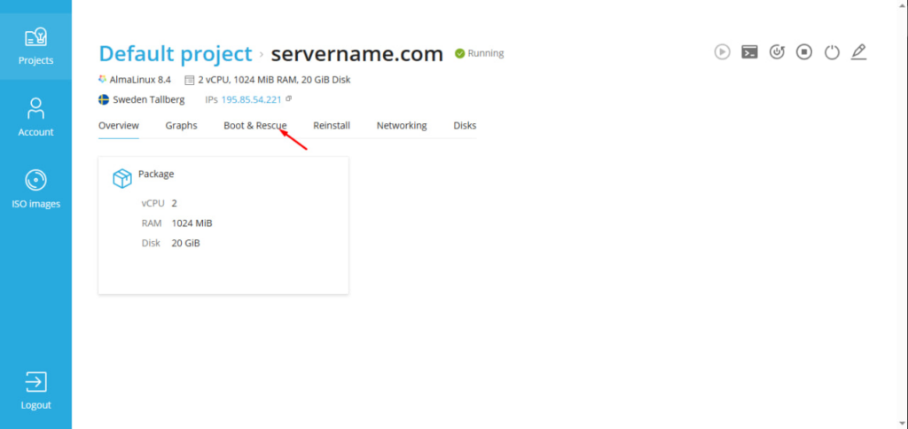 In the top menu of the server, open the Boot & Rescue tab.