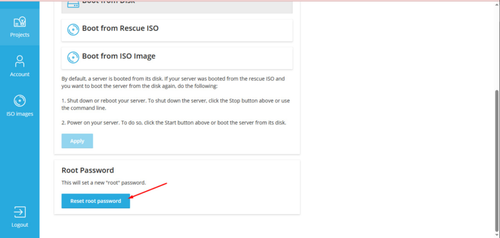Scroll down to the Root Password section and click the Reset root password button.