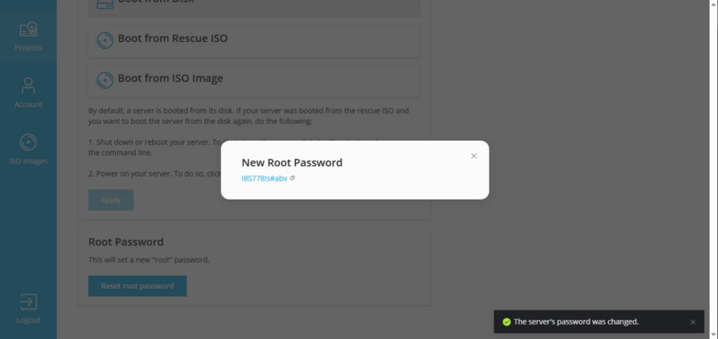 After confirmation, the New Root Password window will appear with an automatically generated password.